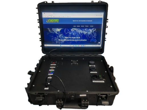 Tem autonomia sem carregar a bateria, por cerca de 3 horas. Inclui antenas base e cabos de RF e alimentação. Suportes tipo Tripé para as antenas.